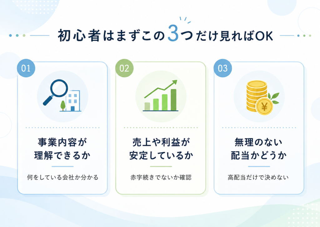 まずは「事業内容がわかるか」「売上や利益が安定しているか」「配当が無理をしていないか」の3つからで大丈夫です。