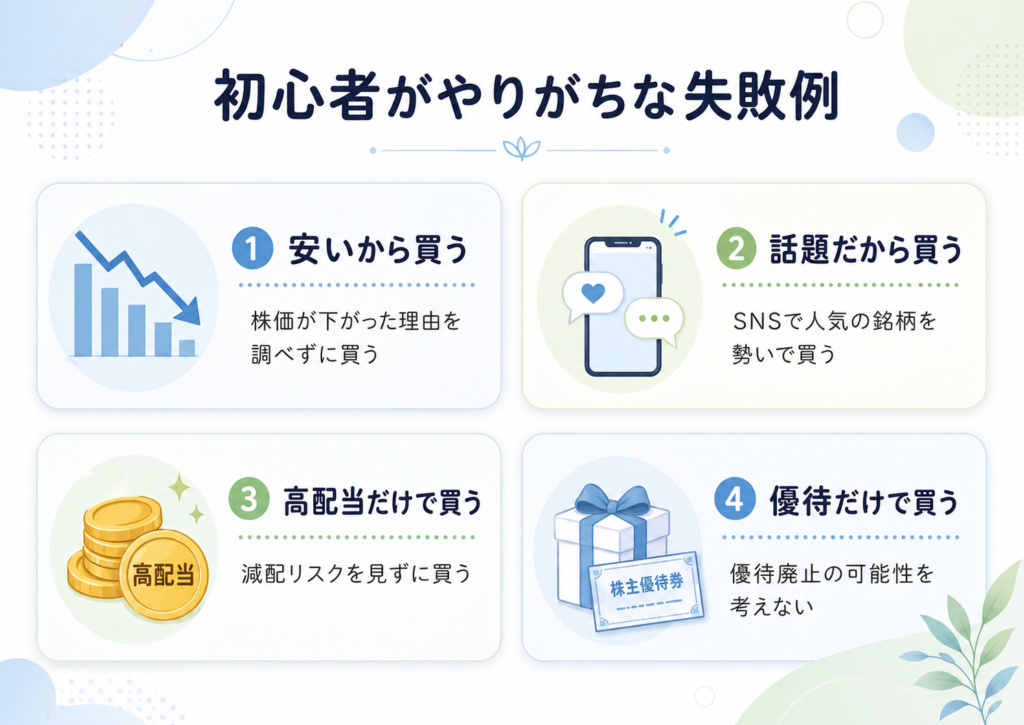 ここでは、初心者がやりがちな株選びの失敗を見ていきます。