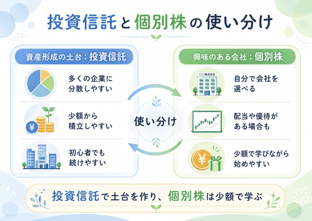 投資信託で資産形成の土台を作り、個別株は少額で学ぶという使い分けもあります。