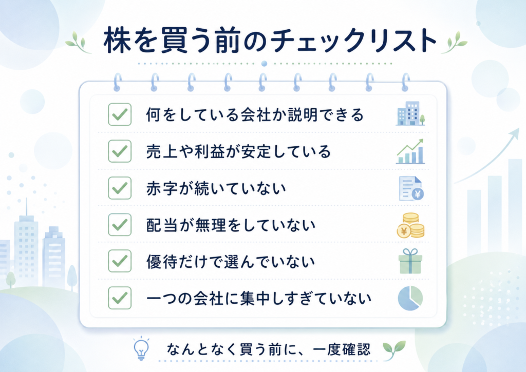 初心者が株を選ぶときは、次のように確認すると整理しやすいです。