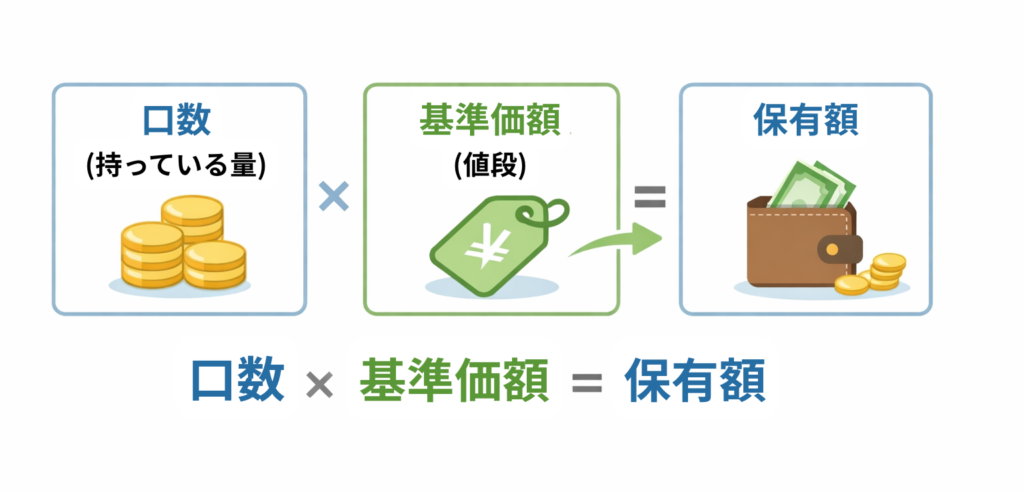 口数で「どれだけ持っているか」が分かり、基準価額で「いくらになっているか」が分かる仕組みです。