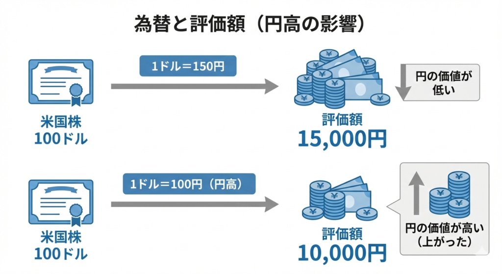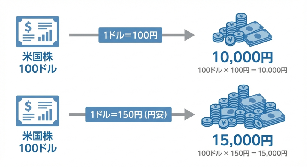 円高とは、「1ドル150円かかっていたものが、1ドル100円で買えるようになる状態」と考えると、直感的に理解できます。