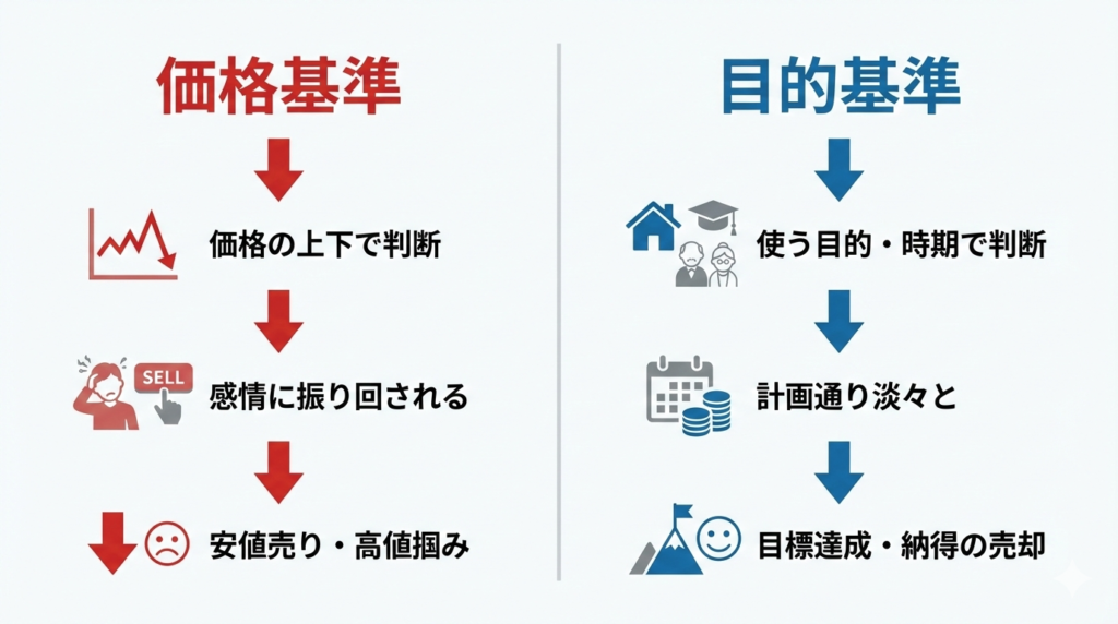 価格を基準にすると、感情に左右されやすく、暴落時に売ってしまうリスクが高くなります。